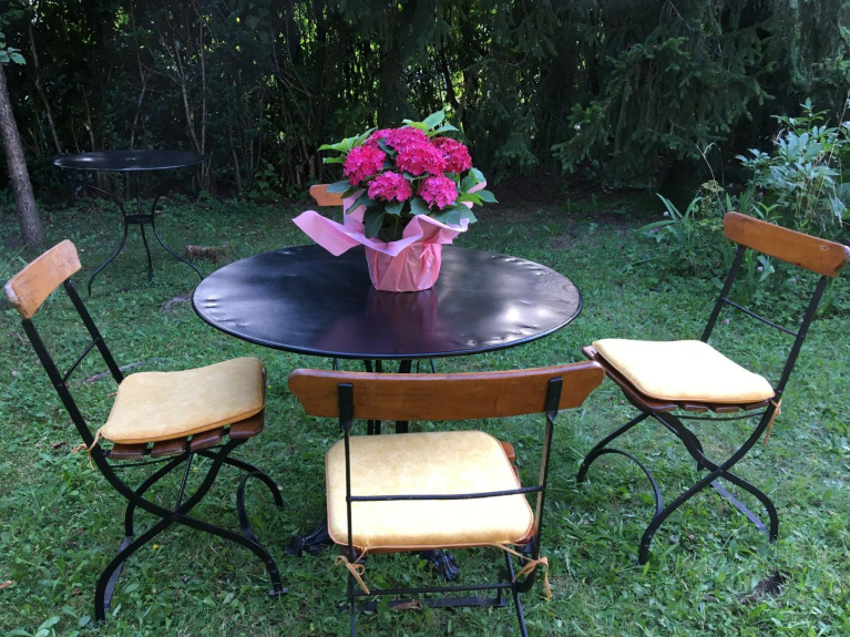 - un gran jardín de 950m2 con árboles, equipos de jardín de hierro fundido y madera y BQ, tranquilo y soleado, con garaje.