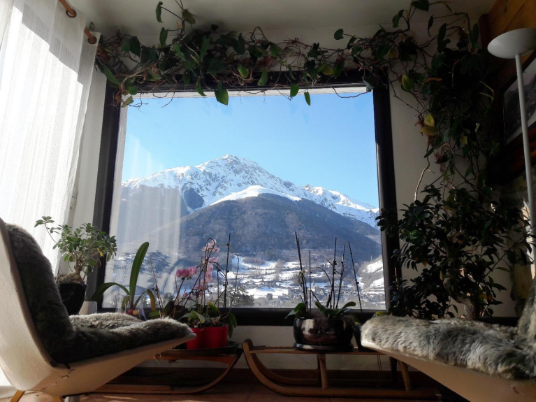 Planta baja: gran sala de estar (85m2): cocina, sala de estar con gran mesa de comedor y chimenea (no se permite asar a la parrilla). Un gran sofá esquinero. Más un trastero independiente.1 Gran ventanal con vistas a la montaña.