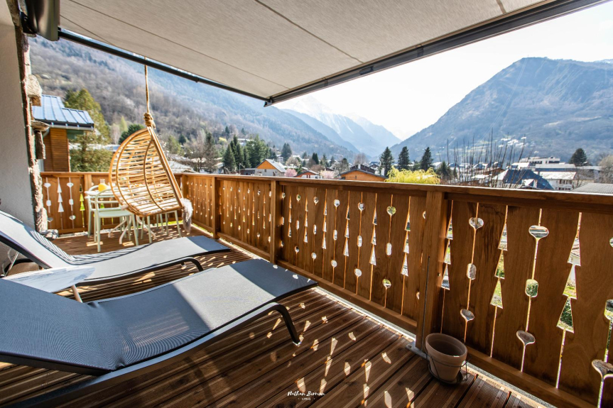 Balcón-terraza de 30 m² equipado con mesas y muebles de jardín, tumbonas y protegido por dos persianas, con unas vistas impresionantes.
