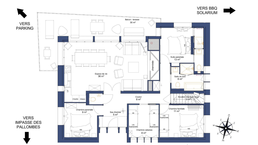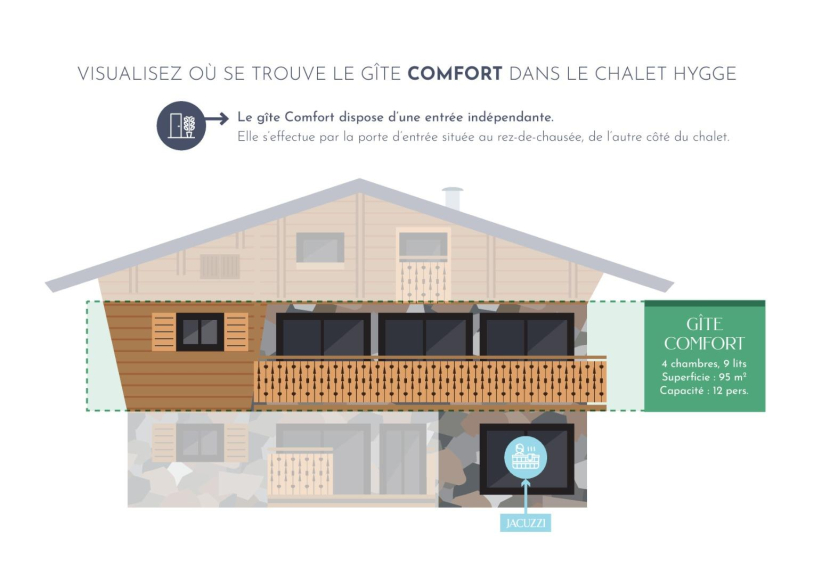 La casa rural Comfort tiene capacidad para 12 personas. La gran sala de estar de 36 m² se compone de una cocina americana totalmente equipada con una gran mesa de comedor, un salón de TV muy acogedor con una chimenea monumental Bigourdane en piedra de Rioumajou y un salón de TV con dos grandes sofás, que se abre al balcón-terraza a través de cuatro grandes ventanales que ofrecen una vista excepcional de 180° de la estación y de los Pirineos.