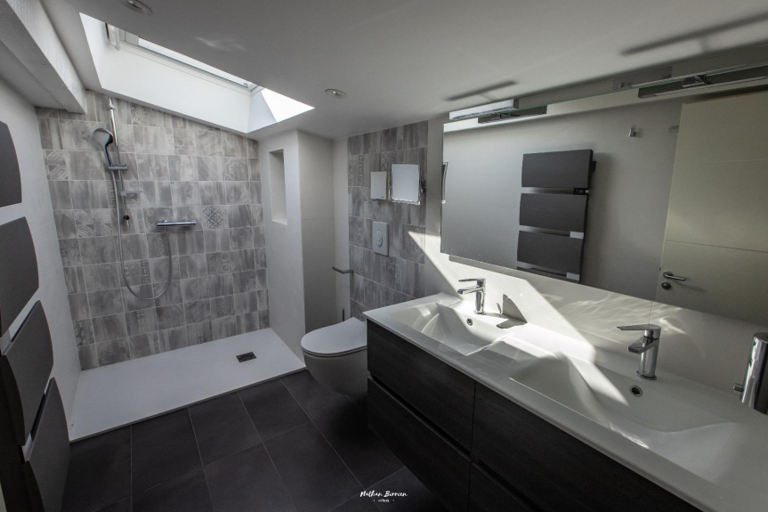 La suite principal es un gran dormitorio doble con cuarto de baño en suite con lavabo, ducha italiana y toallero eléctrico.