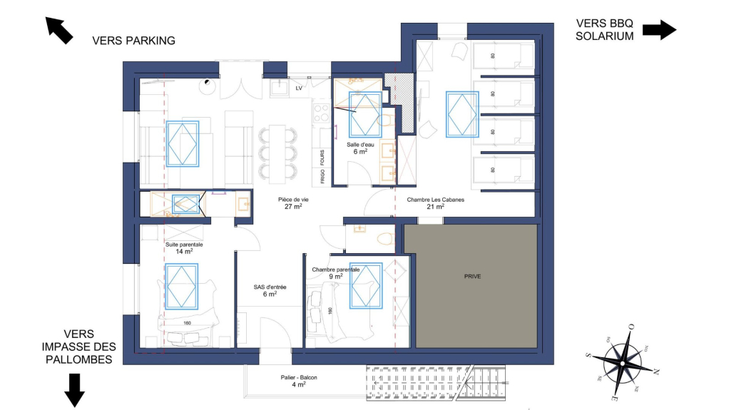 La felicidad absoluta de los niños (¡o de los adultos que no han perdido su espíritu infantil!): el dormitorio con 4 camas japonesas tipo futón en alcobas de 80 cm donde se sentirá como en una "cabaña" (Atención: altura del techo del dormitorio = entre 1,6 m y 1,2 m; alcobas entre 1 m y 0,6 m).