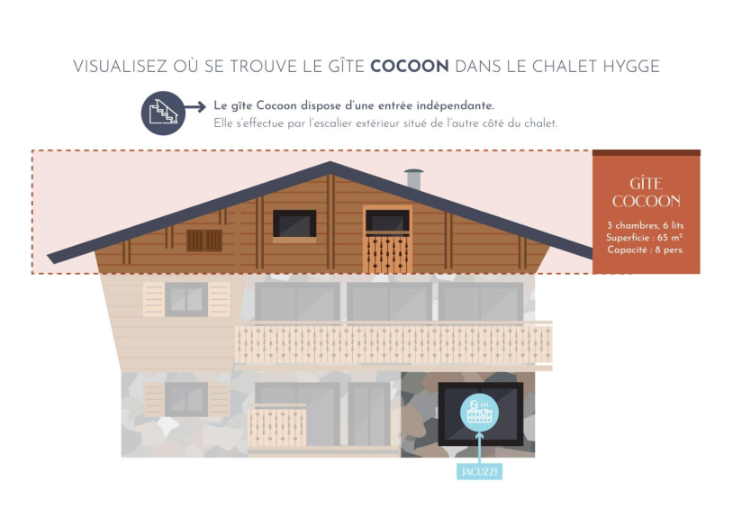 La casa rural Cocoon tiene capacidad para 8 personas. La gran sala de estar de 30 m² cuenta con una cocina americana totalmente equipada, un salón de TV muy acogedor con estufa de leña, una zona de comedor/dormitorio y un salón con dos grandes sofás convertibles en comedor, con unas vistas excepcionales de la estación y de los Pirineos.
