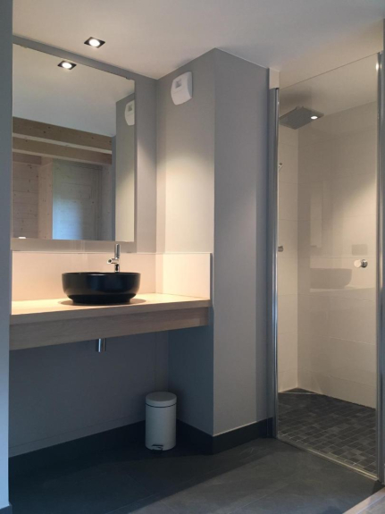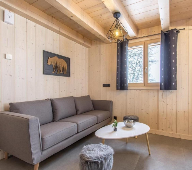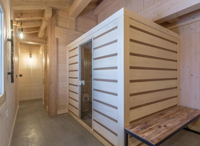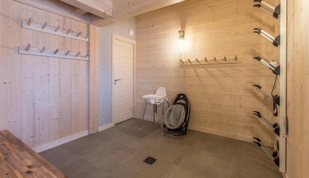 La planta baja consta de una cocina abierta a un salón-comedor, un dormitorio principal con baño, un aseo independiente, una sala de esquí (secador de botas y guantes) y una sauna. En la primera planta hay 2 dormitorios, un baño con bañera y un aseo independiente.