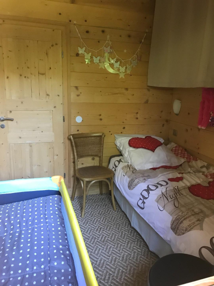 Alojamiento: Un dormitorio con una cama doble, un dormitorio con una cama individual y una cuna, un altillo con un sofá cama.