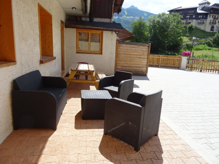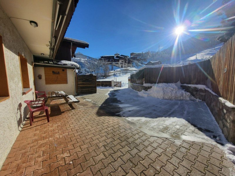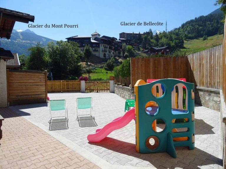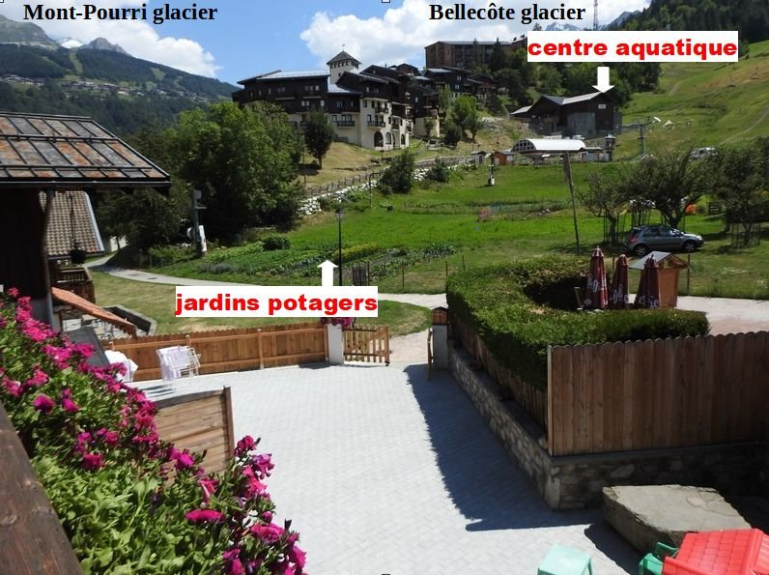 Desde la gran terraza orientada al sur, podrá admirar los glaciares Bellecôte y Mont Pourri, las pistas de esquí en invierno y los prados y huertos en verano. La terraza está equipada con una mesa y un banco de madera, sillas de plástico, persianas con protección UV y tumbonas. Es el lugar perfecto para relajarse en una tumbona en un entorno majestuoso.
