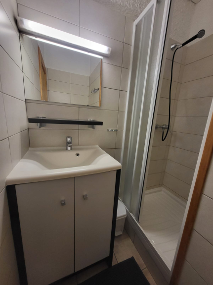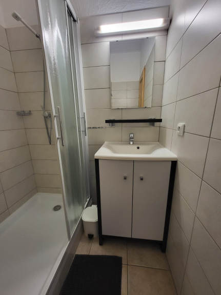 - 1 cuarto de baño: 1 ducha, lavabo, armario, alfombrilla de baño, papelera, soporte para guantes de aseo, ganchos para toallas