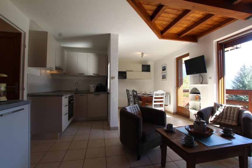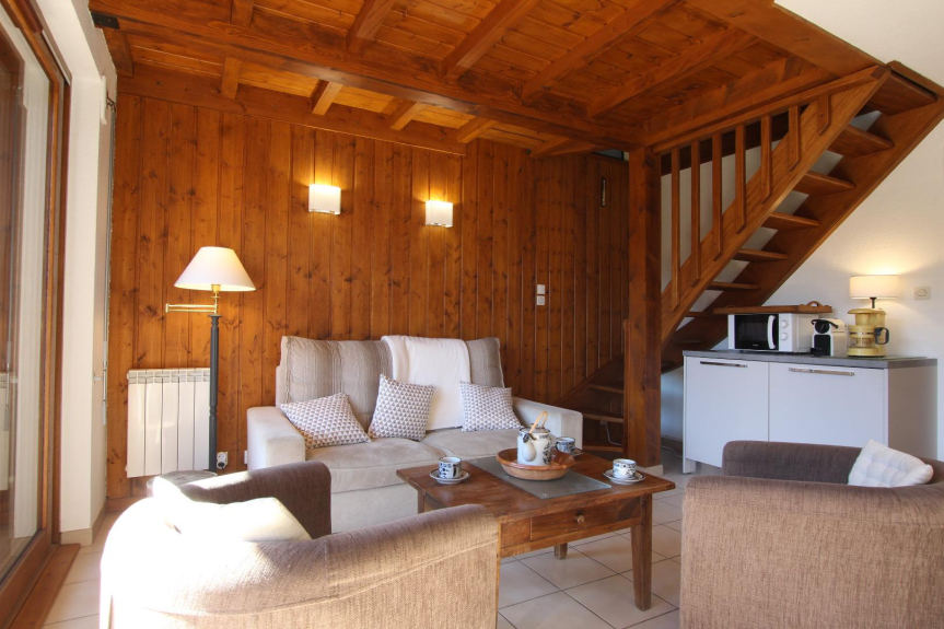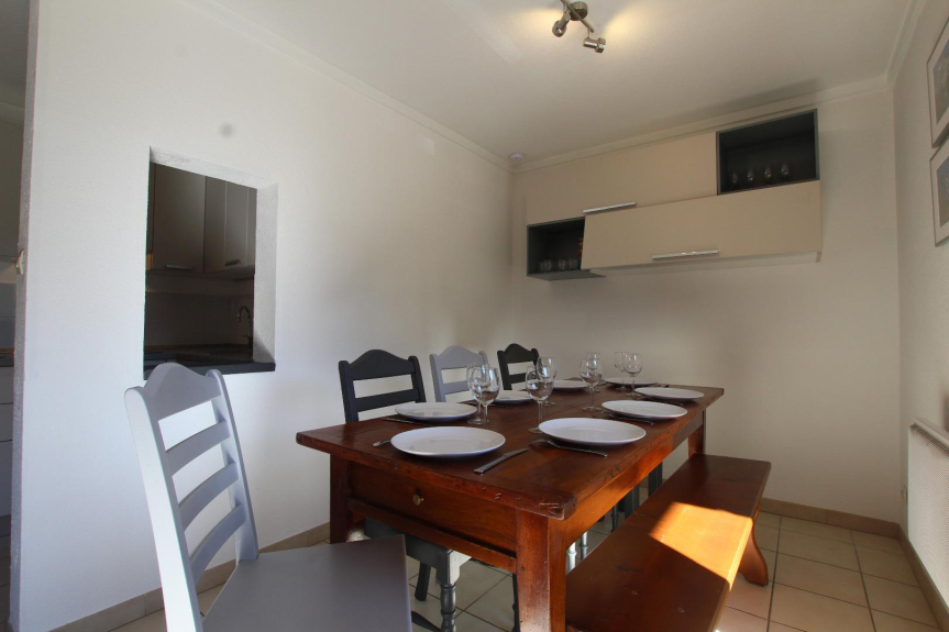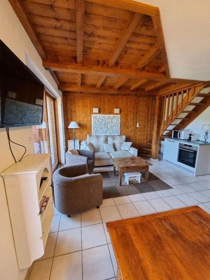 En la planta baja: rincón de montaña cerrado con literas, cuarto de ducha, WC separado, cocina totalmente equipada abierta a la sala de estar, salón con televisión, comedor. Balcón.