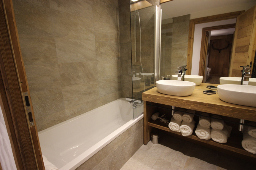 - Dos suites con cama doble y cuarto de baño privado con ducha, lavabo e inodoro
