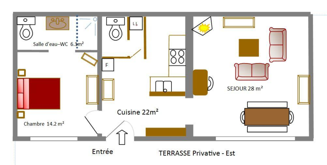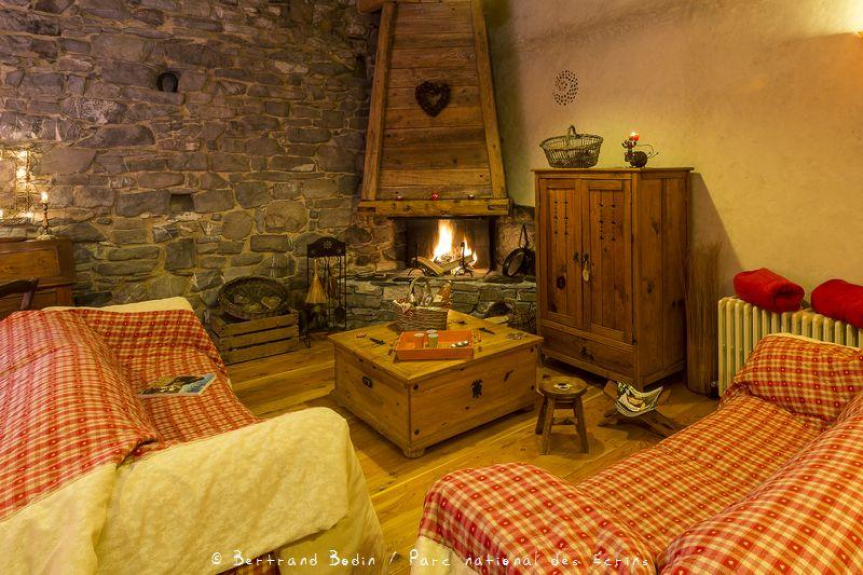El salón-comedor está equipado con un escritorio (acceso a Internet), una chimenea (leña suministrada), una biblioteca con novelas, libros, varias revistas (Montagne Magazine, National Géographic, Vertical, Alpes Magazine, Parapente Mag, etc.), 2 sofás, televisión, reproductor de DVD (con una selección de DVD), mini equipo de música, numerosos juegos de mesa.