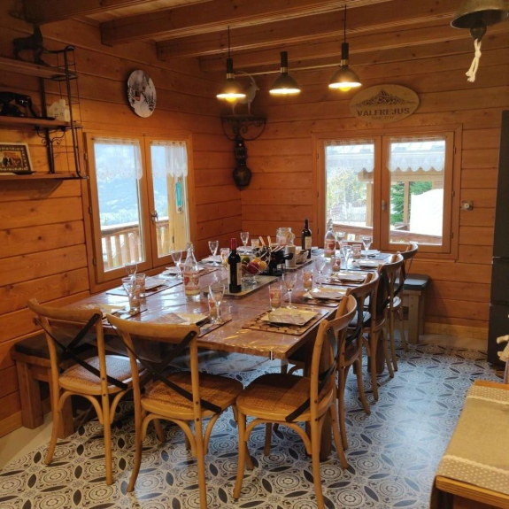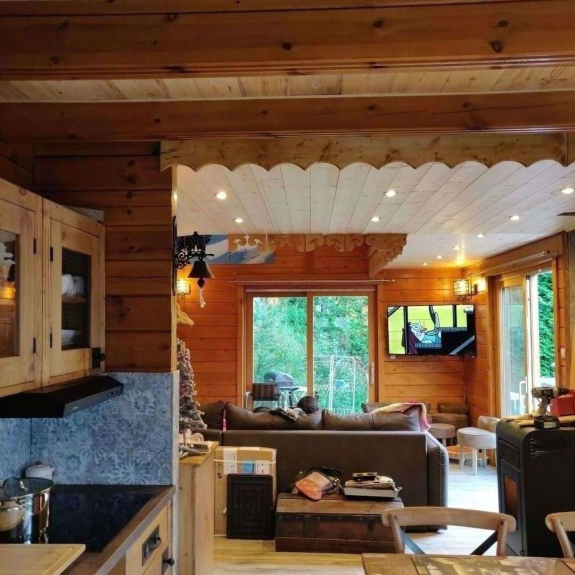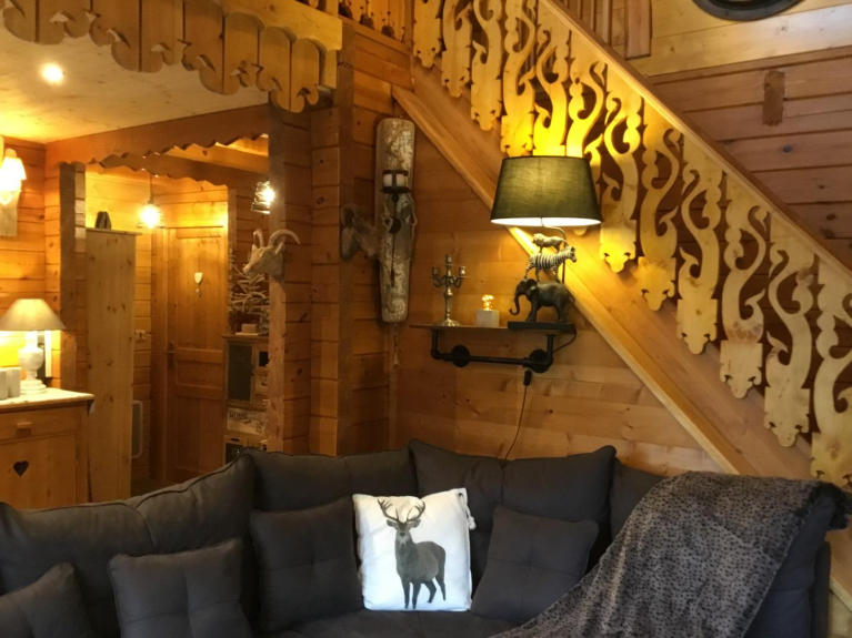 En la primera planta: un gran salón con zona de estar alrededor de una estufa de pellets. Gran balcón orientado al sur/oeste con una magnífica vista del macizo de la Vanoise. Cocina abierta con zona de comedor para 12 personas, equipada con lavavajillas, frigorífico americano, horno, microondas, placa de inducción y todo el equipamiento eléctrico (tostadora, cafetera Senseo, batidora, aspiradora Dyson, plancha y tabla de planchar, hervidor...). Un aseo independiente. Un cuarto de baño con bañera separa un dormitorio con cama doble y otro con 4 camas individuales para la felicidad de los niños.
