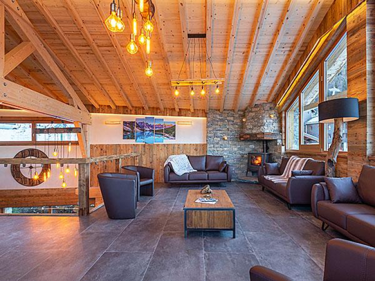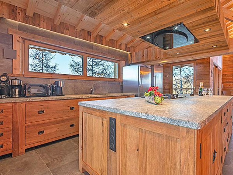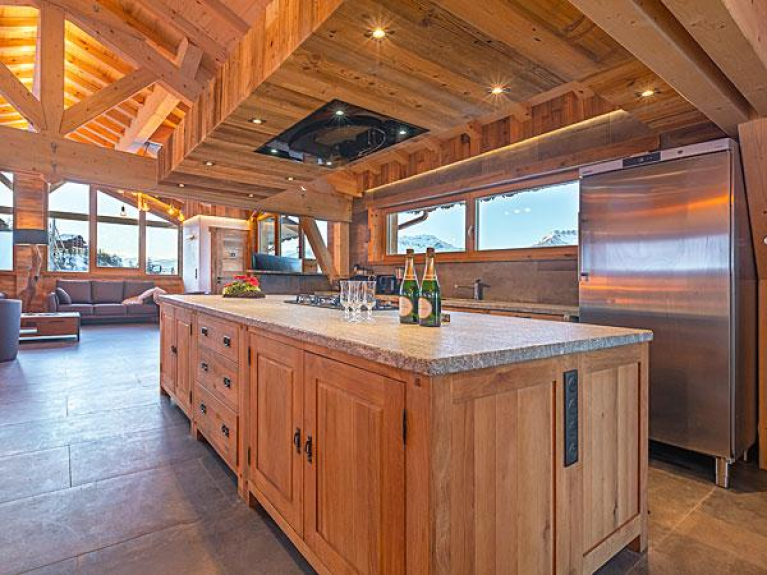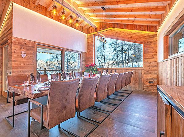 Nivel 2: La cocina es moderna y está totalmente equipada, con un gran frigorífico y congelador independiente. El luminoso y espacioso salón con su gran sofá crea un ambiente acogedor con la chimenea. Sistema de música Bluetooth. TV de pantalla plana con 160 cm de diagonal. En el mismo nivel se encuentra el agradable comedor, con una gran mesa para 15 personas. Acceso a la terraza panorámica.
