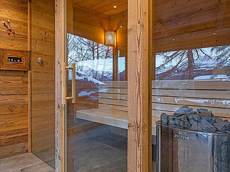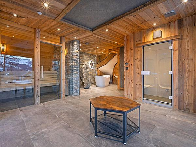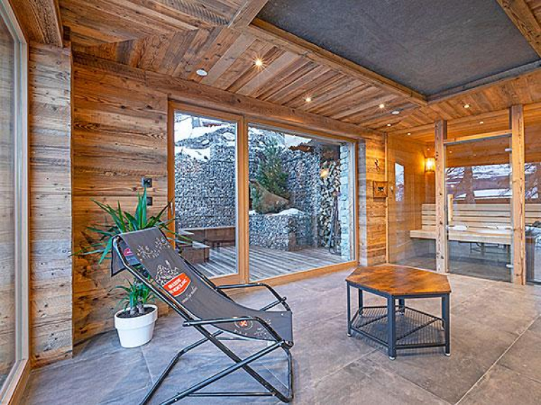 La gran zona de descanso también se encuentra en este nivel: Después de esquiar, disfrute del jacuzzi exterior para 6 personas, sauna, baño de vapor, bañera refrescante y ducha extraíble con cubo de agua fría; relájese en la zona de descanso con estas tumbonas.