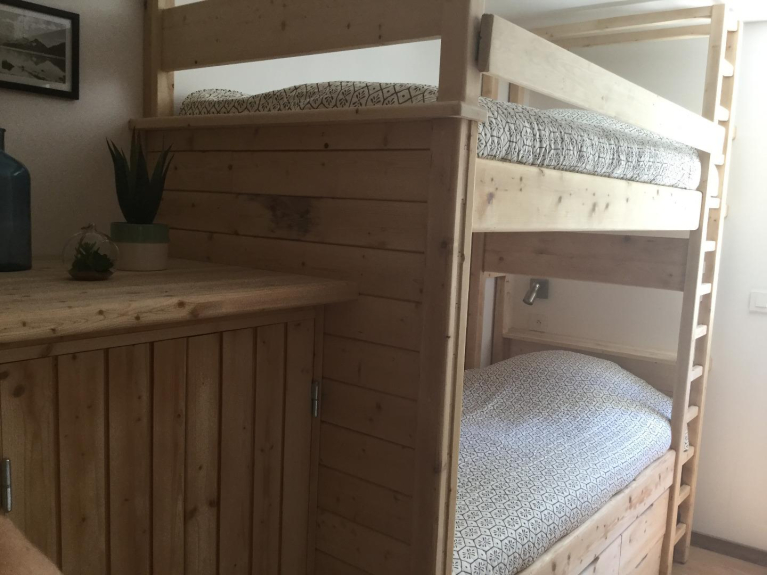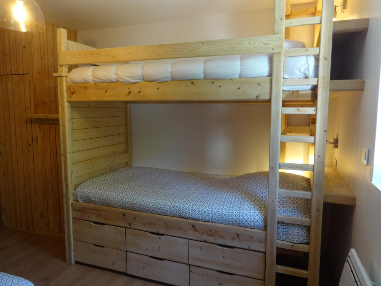 Idealmente situado, muy bien equipado, salón abovedado con chimenea, 1 cuarto de baño, 1 cuarto de ducha, 1 dormitorio con una cama doble, 1 dormitorio con 2 literas y una cama doble.
