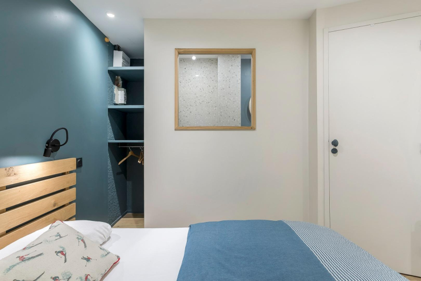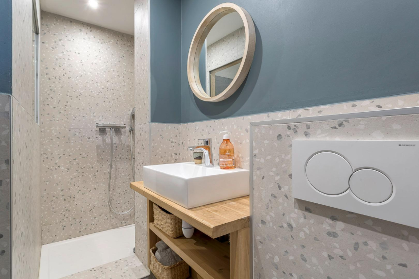 Disposición ideal para 2 familias con dos habitaciones separadas para dormir/duchas y una zona de estar central.
