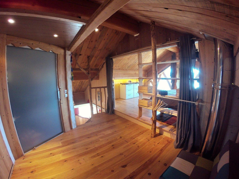 En la planta baja: Detrás del salón, 1 dormitorio (separado por la noche por cortinas) con una cama de 140 cm y un colchón de 12 cm