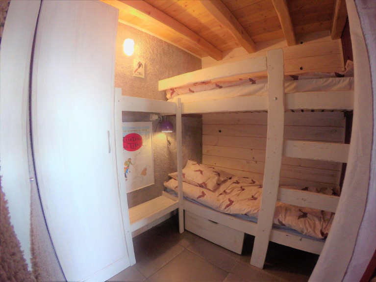 1 habitación de esquina (separada por la noche con cortinas) con 2 literas de 80 x 180