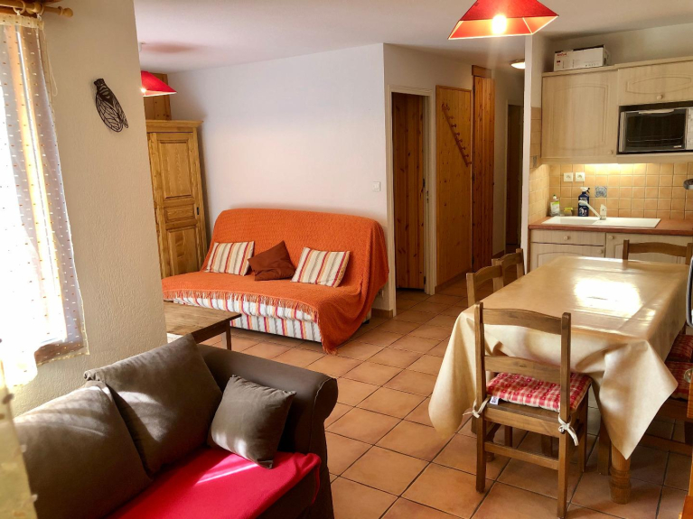 Sala de estar con una cocina abierta muy bien equipada (lavavajillas, microondas, mini-horno, hervidor de agua, tostadora, etc.), una zona de estar con 2 sofás (uno de ellos convertible), un dormitorio con una cama doble, un dormitorio con dos literas, cuarto de baño con bañera, WC separado.