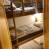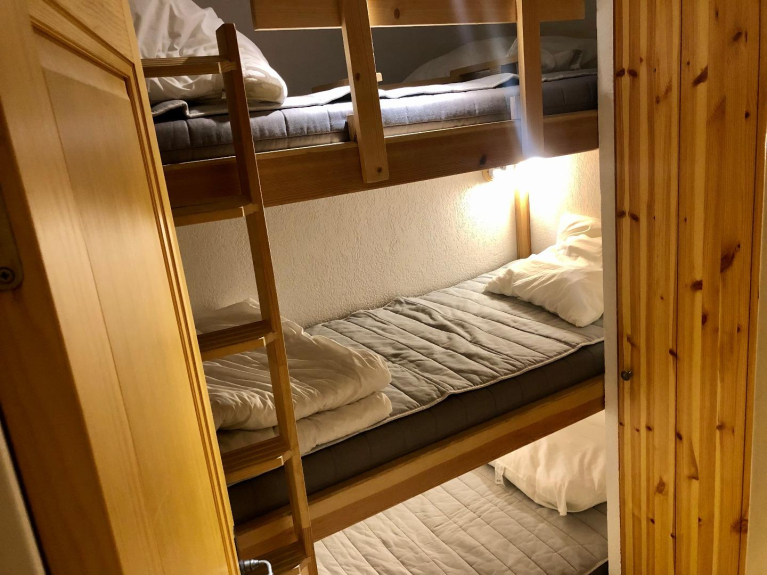 Salón con cocina abierta, zona de estar, un dormitorio con cama de matrimonio, un dormitorio con literas, un baño, WC separado.