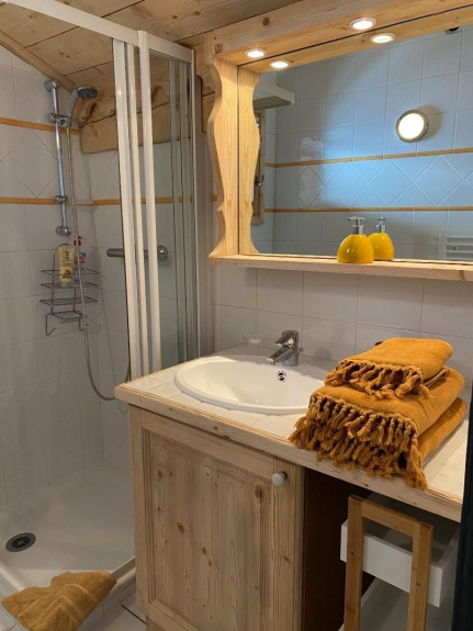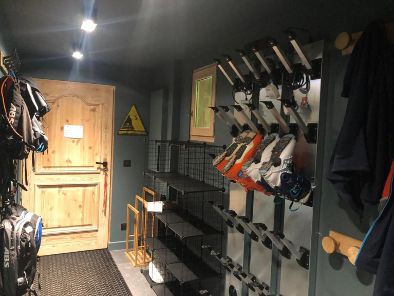 - una sala de esquí equipada con 18 secadores de zapatos, ganchos para la ropa y estantes para el pequeño equipo (cascos, guantes, gafas,...). La sala de esquí tiene acceso directo al exterior.