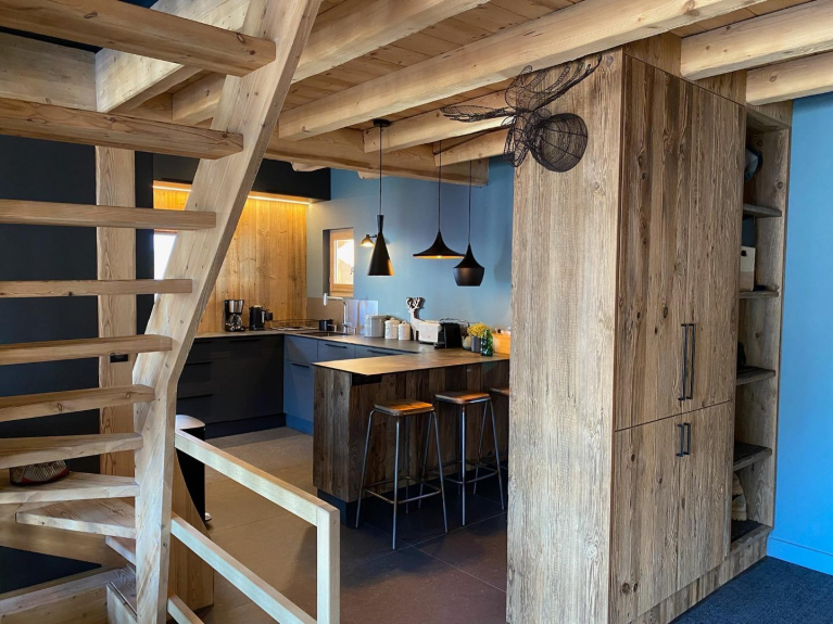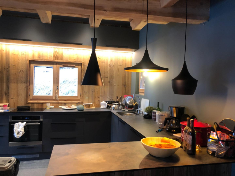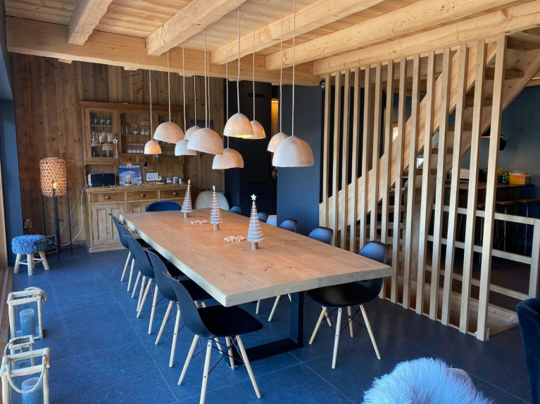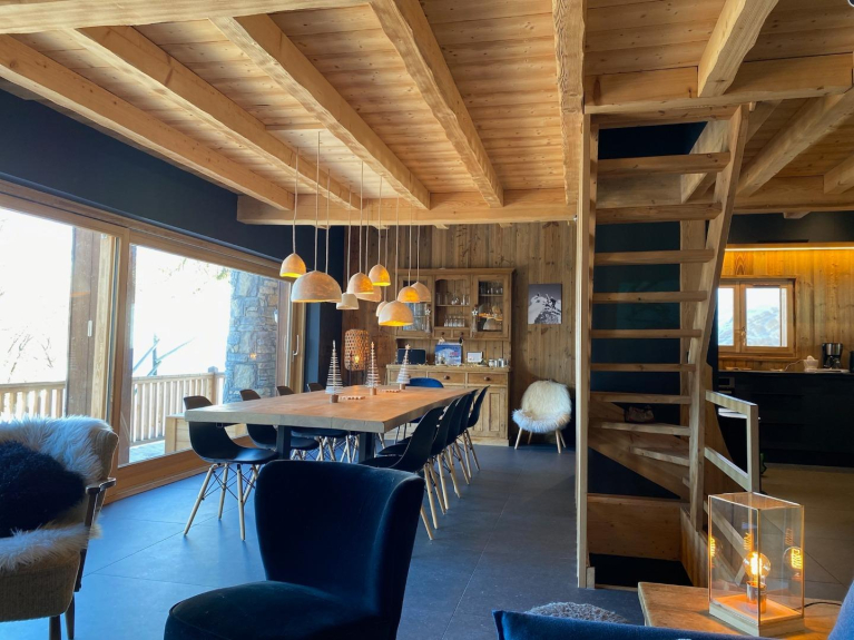 La planta baja se compone de un gran salón de planta abierta con vigas a la vista y chimenea de hogar cerrado, una cocina totalmente equipada con una zona de bar y un comedor con una gran mesa frente al Mont Pourri.