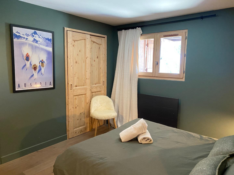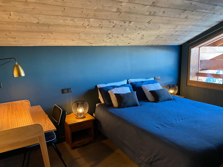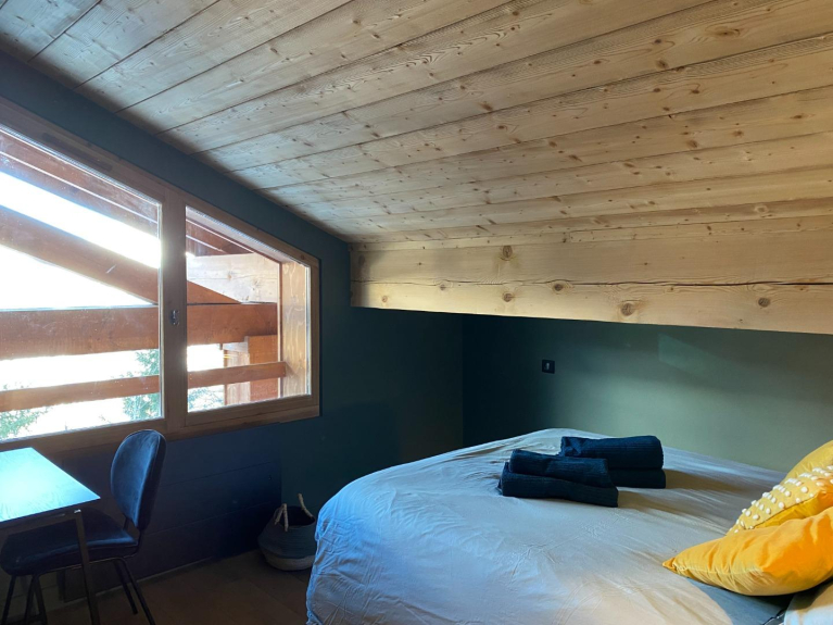 Toda la habitación está bañada de luz gracias a un gran ventanal de más de 6 metros de largo que da a una terraza/balcón de 20 m2 con una vista totalmente despejada del Mont Pourri sin zonas de paso.