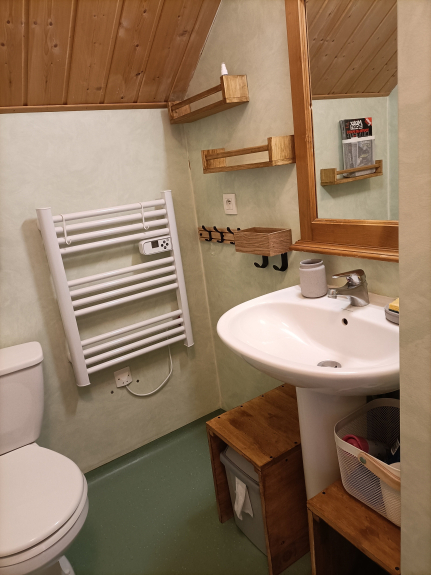 El chalet se compone de una entrada, un dormitorio (con literas), un cuarto de baño, un aseo, una sala de estar/cocina (17m2) con un sofá cama en la planta baja.