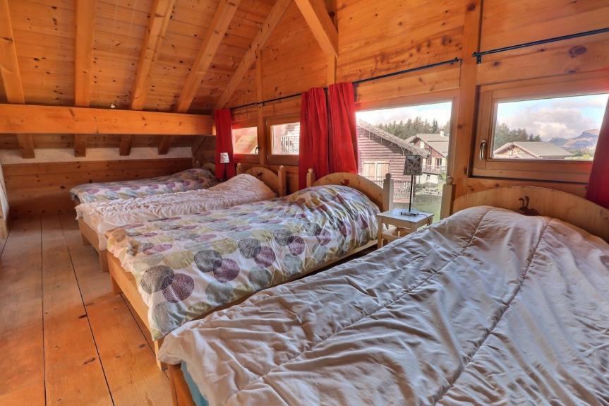 En la primera planta hay un gran dormitorio con 4 camas individuales una al lado de la otra, que se comunica con el entresuelo, que se ha transformado en una sala de estar para niños, para que los padres puedan disfrutar de la sala de estar mientras los jóvenes se divierten arriba.