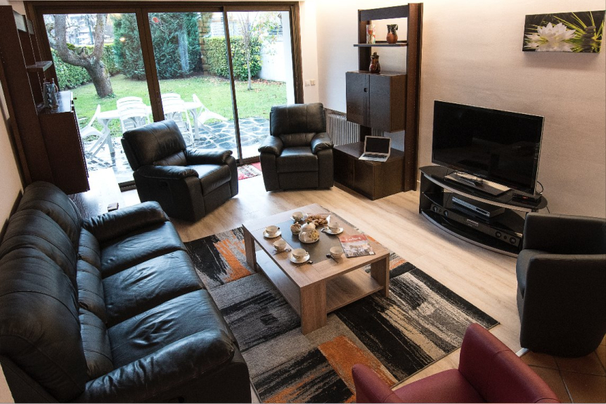 - Planta baja: Una gran entrada por el lado de la calle y otra por el lado del patio, una amplia cocina totalmente equipada, una habitación infantil con TV, un aseo, un gran salón-comedor con chimenea que da a una terraza y al jardín.