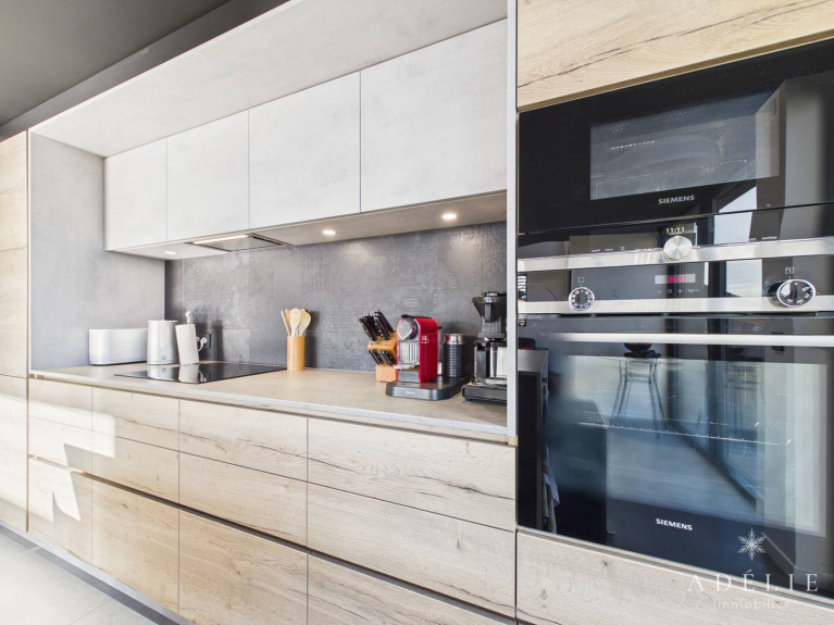 Cocina totalmente equipada: vitrocerámica, nevera y congelador, lavavajillas, horno, microondas.