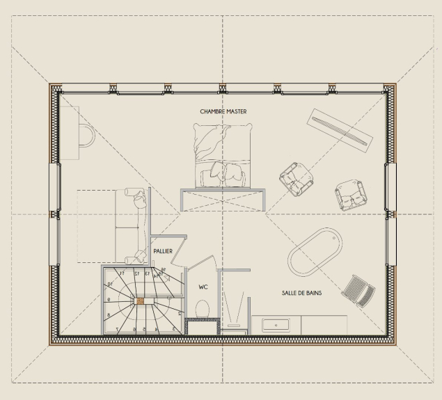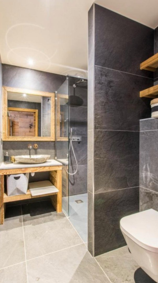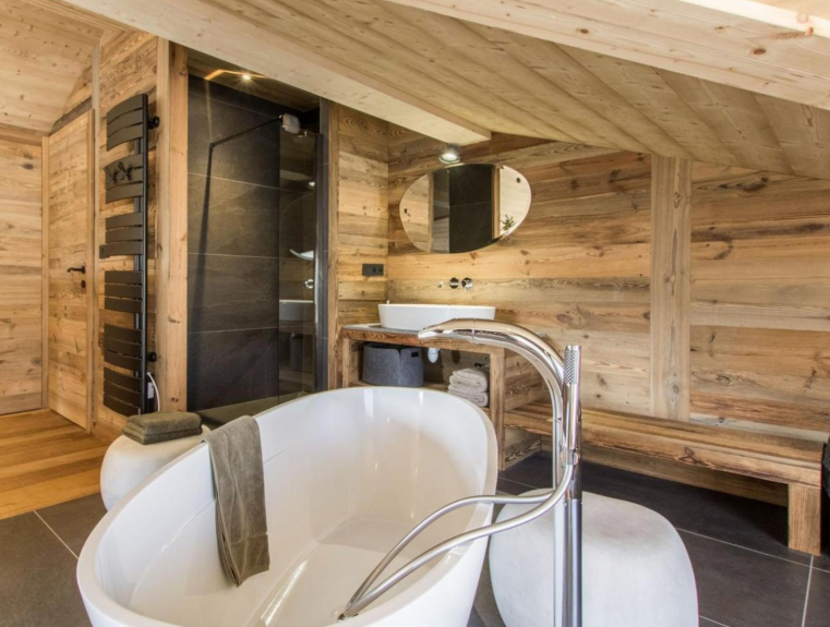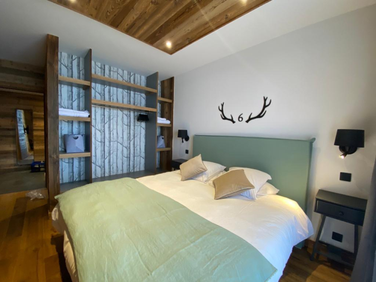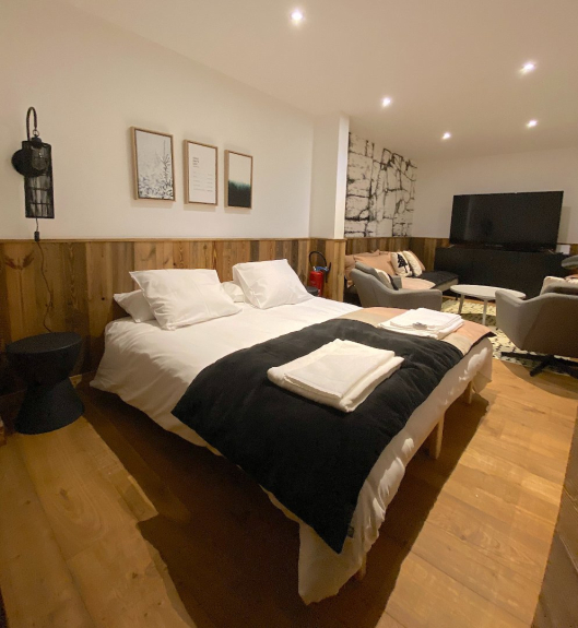 - 1 suite con una cama de 180x200 cm bajo el techo con un sofá cama que puede acoger 2 camas supletorias y una zona de despacho y un baño con ducha con vistas a las pistas.