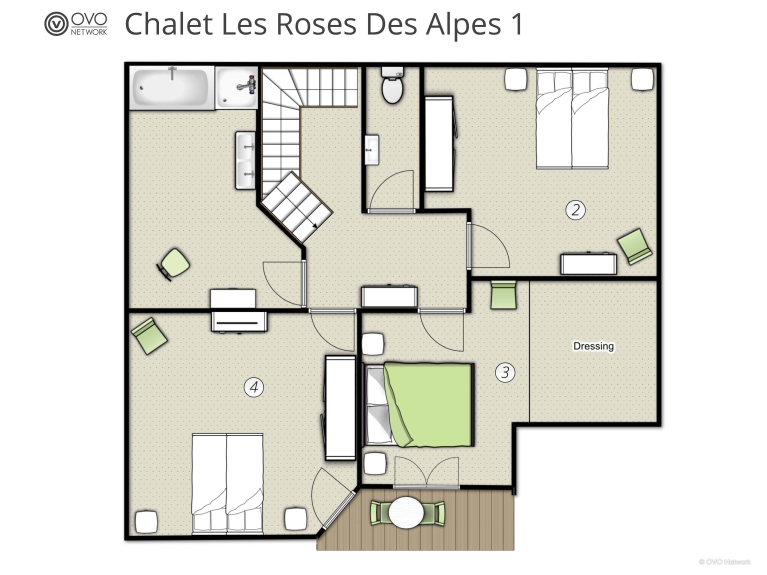 Hay cuatro dormitorios dobles, tres de los cuales se pueden convertir en dos camas individuales, y dos baños para un máximo de ocho personas. El chalet es increíblemente grande y luminoso, y dos de los dormitorios se abren a un soleado balcón.