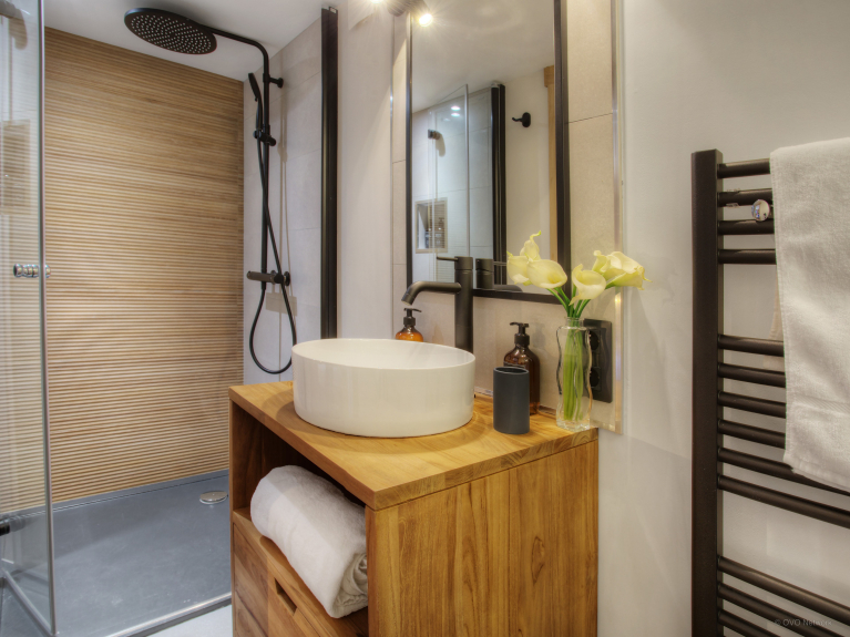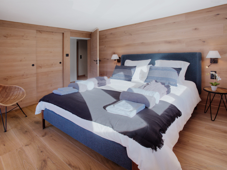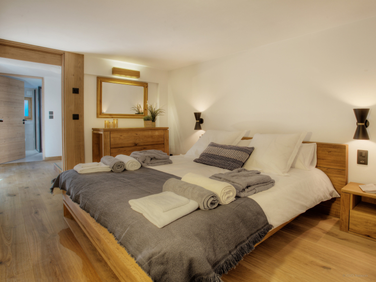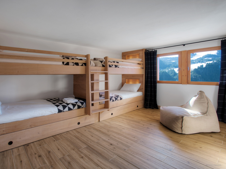 En el lavadero a nivel del jardín, al que se accede desde el aparcamiento, se encuentra una sala de esquí con un porta botas calentado para 12 pares de esquís. El dormitorio de los niños se encuentra en este nivel, así como su cuarto de baño con bañera exenta, lavabo doble y aseo separado. En la planta baja superior se encuentran los tres dormitorios dobles, uno de ellos con baño en suite, y un elegante baño familiar con una hermosa cabina de ducha doble. Cada habitación cuenta con mesillas de noche con lámparas y puertos USB para cargar el teléfono, por ejemplo, y puedes ajustar la calefacción de forma independiente a tu gusto con el termostato.