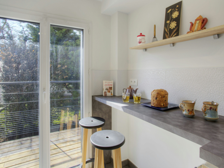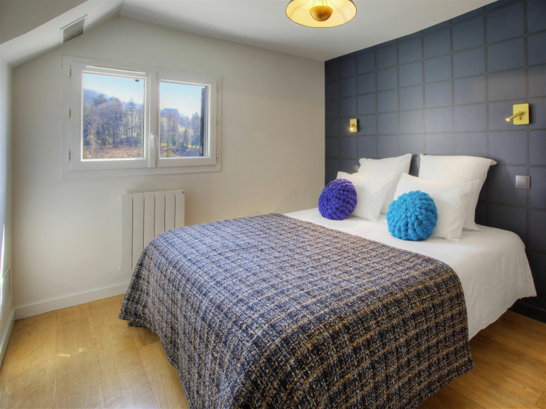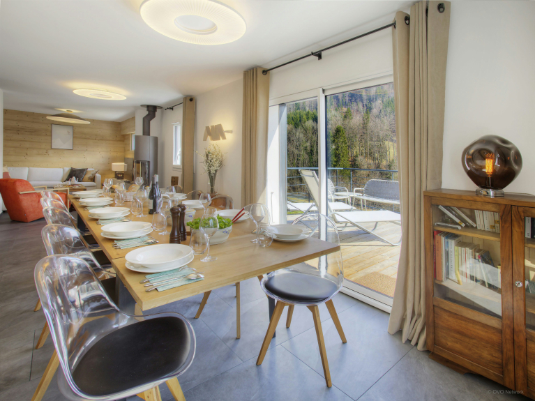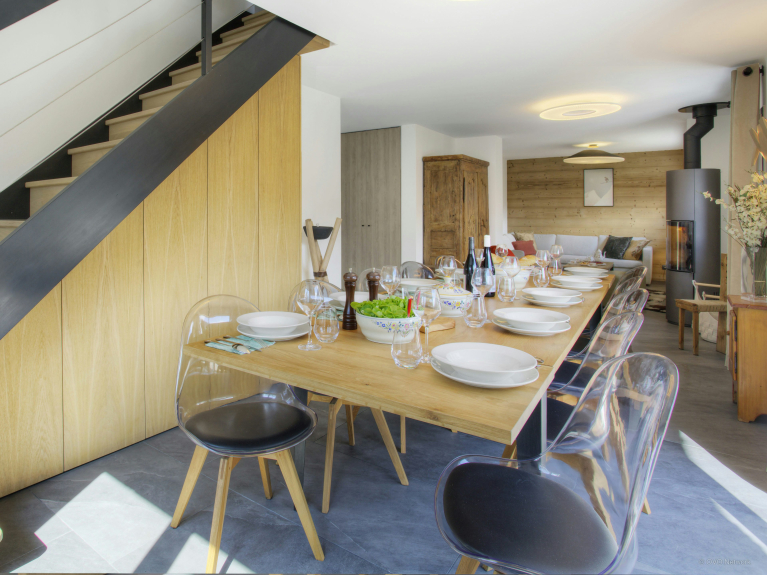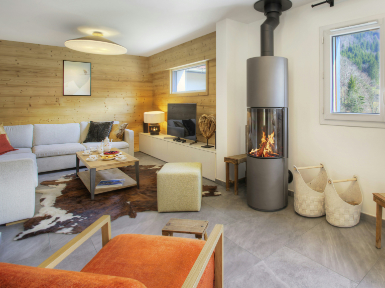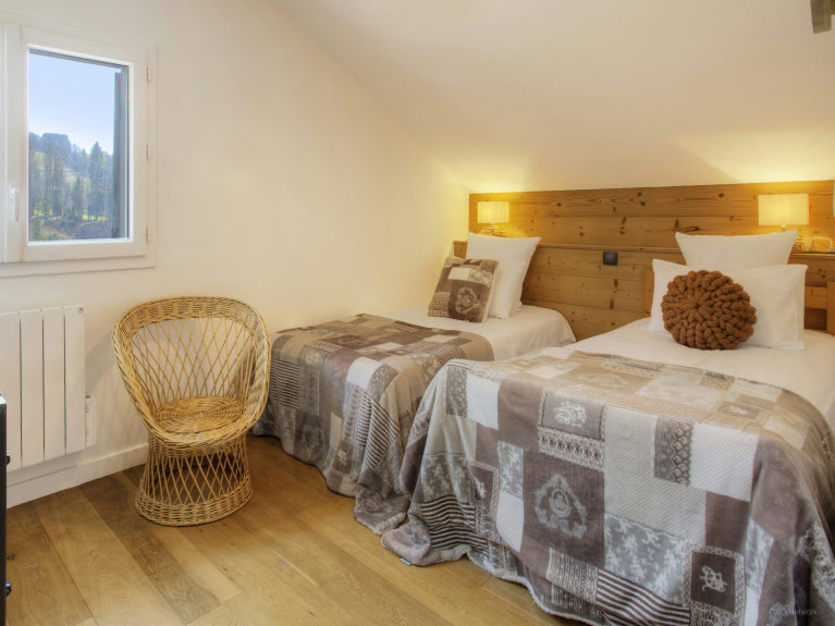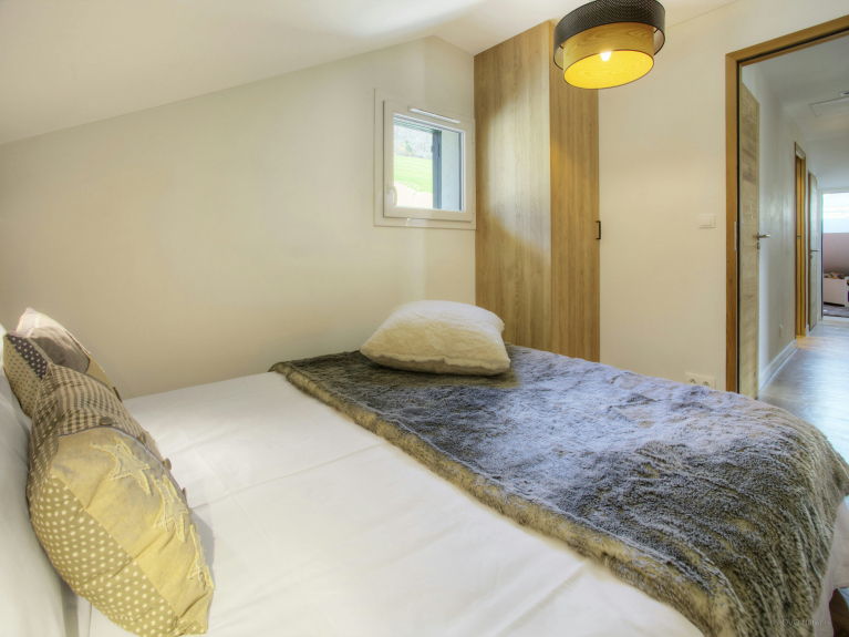El alojamiento se distribuye en dos niveles. La zona de estar se encuentra en la planta baja, mientras que los cuatro dormitorios están en la primera planta. La cocina, totalmente equipada, es elegante y práctica, y cuenta con una barra. Una ventana francesa se abre al balcón. Una ventana francesa se abre al balcón, donde podrá disfrutar de su café matutino mientras admira la hermosa vista y respira el aire fresco de la montaña. El comedor también tiene un ventanal que da acceso a la amplia terraza. Aquí podrá disfrutar de un aperitivo, preparar una barbacoa o simplemente tumbarse en una tumbona para tomar el sol, contemplar las vistas y relajarse.El acogedor salón está dispuesto alrededor de una estufa de leña. La planta baja también incluye una sala de juegos dedicada con un televisor y una consola PS4, donde a los huéspedes más jóvenes les encantará pasar el rato y divertirse juntos sin los adultos.Este es también el nivel donde se encuentra la sala de lavandería, la sala de esquís y bicicletas y un aseo separado.En la planta superior se encuentran cuatro dormitorios. Un dormitorio con dos camas y dos dormitorios dobles, uno de los cuales tiene un cuarto de ducha en suite. También hay un dormitorio encantador y muy luminoso con tres camas individuales. Es ideal para los niños. También hay un baño familiar en este nivel y el chalet tiene tres plazas de aparcamiento, una de ellas cubierta.