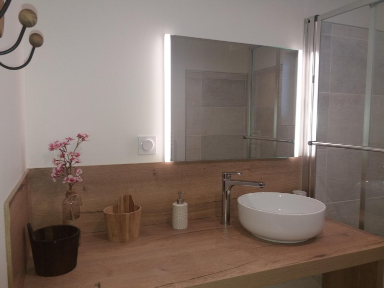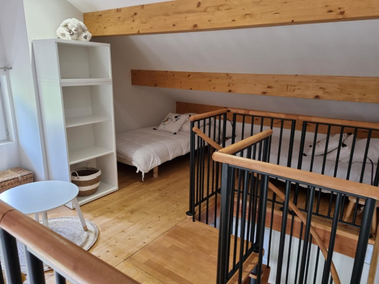 En el entresuelo, abierto a la cocina-comedor, una zona especial acogerá a los niños con un pequeño rincón de juegos y dos camas de 90 cm, un dormitorio independiente con una cama de 140 cm y un cuarto de ducha con aseo.