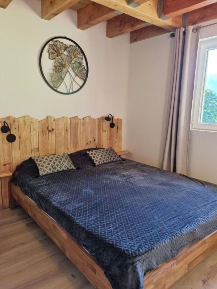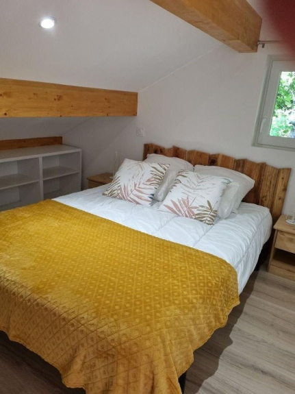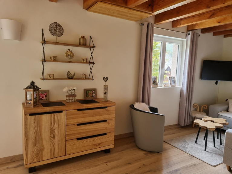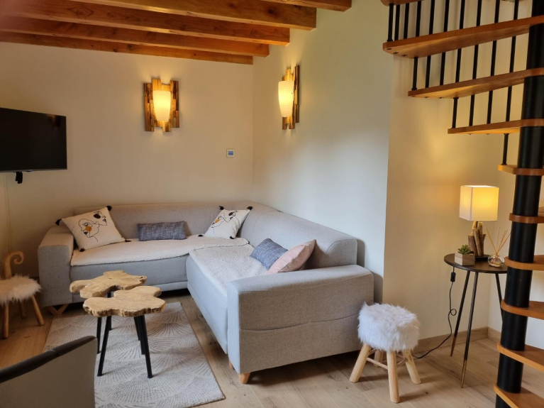 En el primer nivel, una cocina y un comedor con una vista excepcional de las montañas, una sala de estar con un sofá cama convertible para una o dos personas, un dormitorio con una cama doble, un baño y un aseo separado.