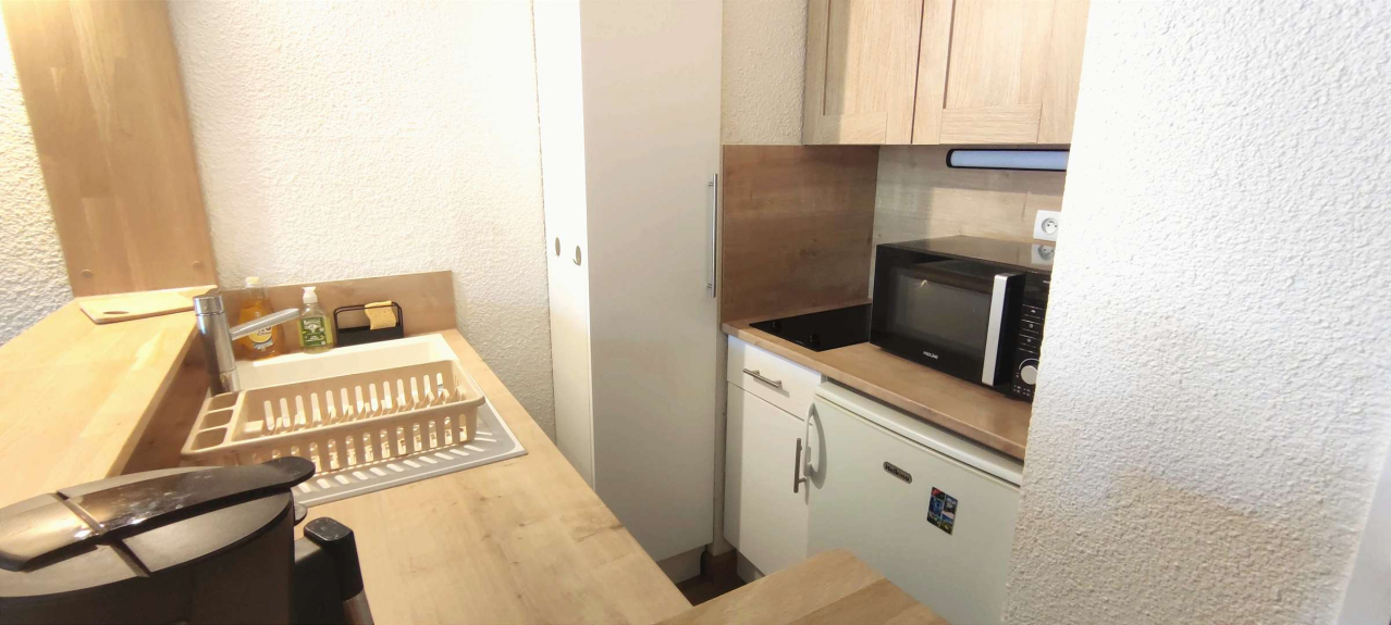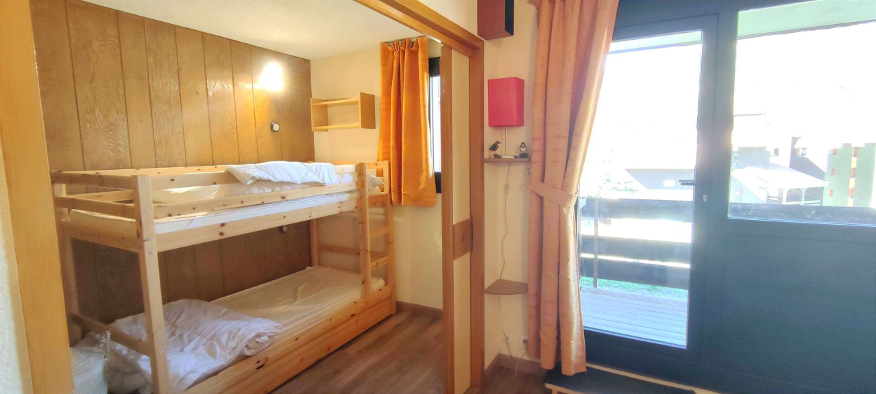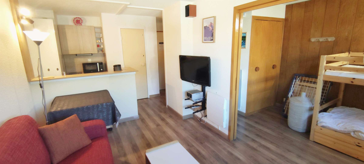 Piso F2 de 35 m², situado en un edificio de chalets en el corazón del Hameau (lado sur de la estación) a 15mn a pie del centro. Con una hermosa vista del centro del Hameau y de las montañas, tiene una sala de estar que se puede dividir en dos mediante una puerta corredera para pasar la noche. Cuarto de baño y WC separado. Suelo de parqué. Bonitos servicios.