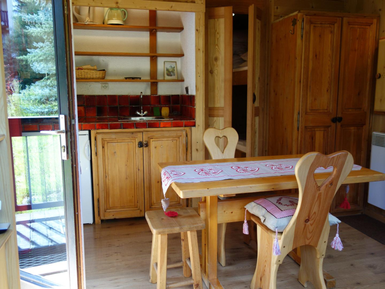 La zona de cocina está equipada con microondas, mini-horno, placa eléctrica, nevera, cafetera, hervidor de agua, tostadora, máquina de raclette.
