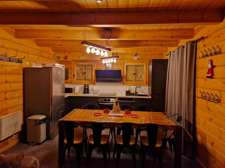 En la cocina, encontrará una cálida mesa de madera para 10 o 12 personas, una placa de inducción con campana, un frigorífico, un horno tradicional, un microondas, una cafetera nespresso y de filtro y electrodomésticos.