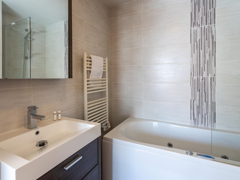 El atractivo salón tiene capacidad para 6 personas, con Smart TV y acceso a un balcón. La cocina/comedor de planta abierta, totalmente equipada, dispone de excelentes electrodomésticos para preparar buenas cenas en torno a la mesa de comedor con 6 sillas. Todas las habitaciones del chalet tienen baño y su propio secador de pelo.