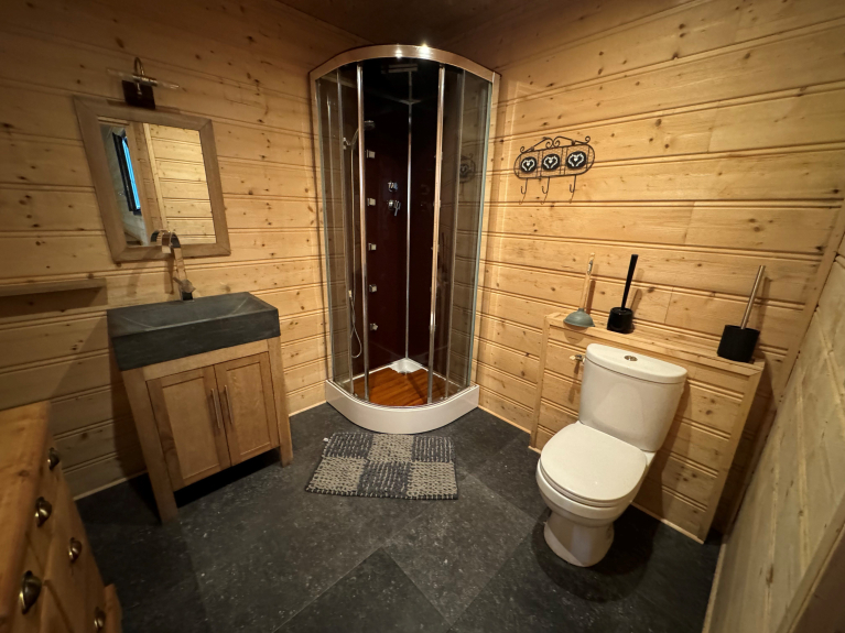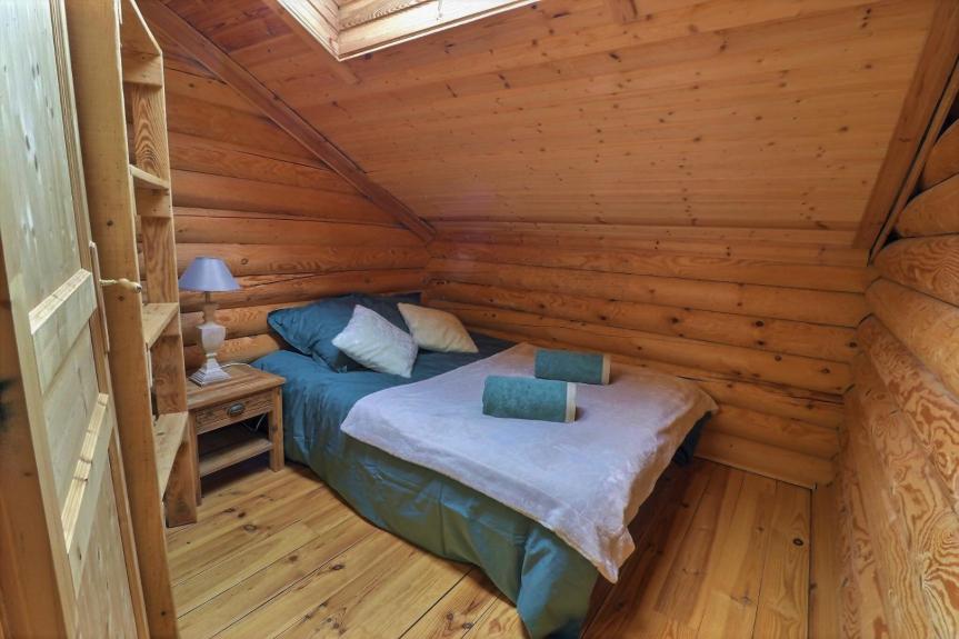 En este mismo rellano un dormitorio doble con una cama de 140 cm + TV, un cuarto de ducha con WC.