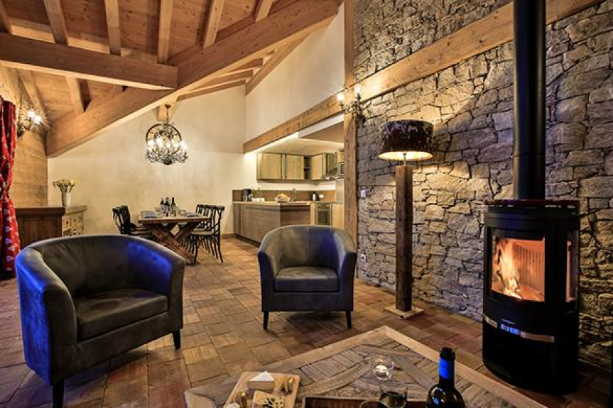 La sala de estar de planta abierta tiene un gran sofá de seis plazas y 2 cómodos sillones, una estufa de leña, un televisor y acceso a un balcón con impresionantes vistas.
