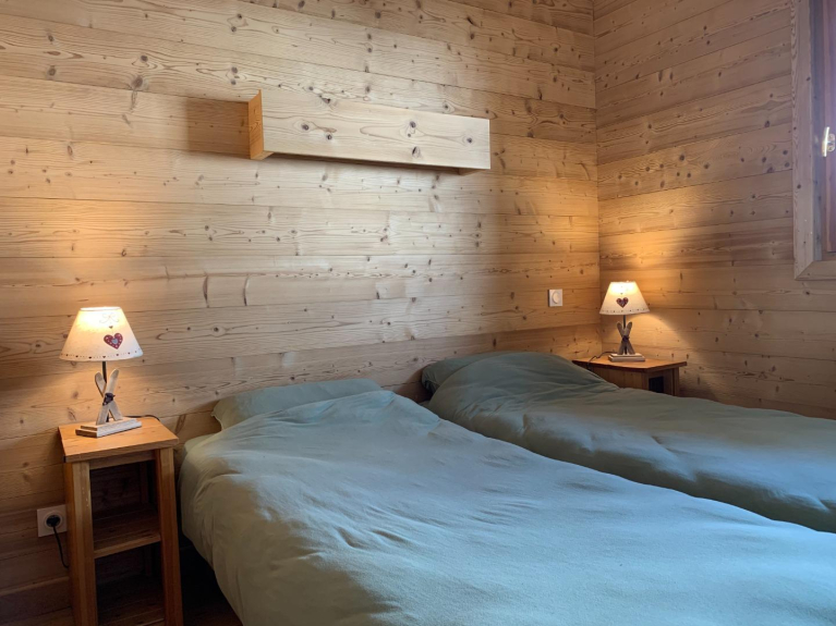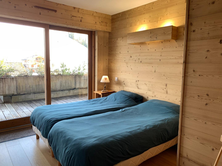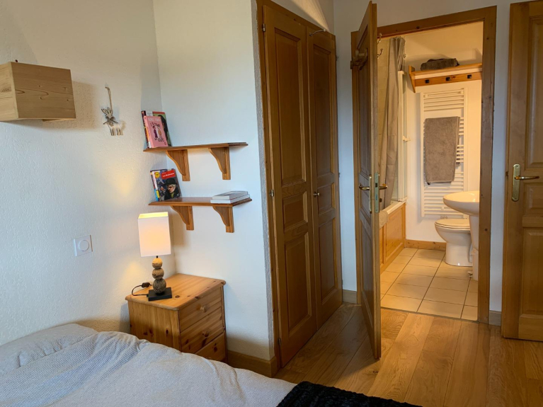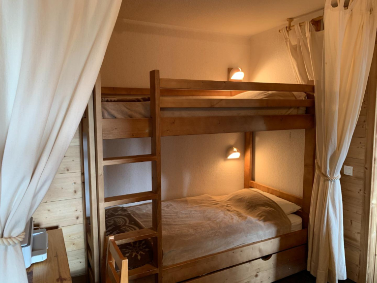Este piso tiene capacidad para entre 8 y 10 personas en 4 habitaciones con 2 camas individuales cada una y una zona de descanso separada con una litera. Tiene una terraza de 90 m2 orientada al sur, con una magnífica vista de las pistas de esquí y la montaña.