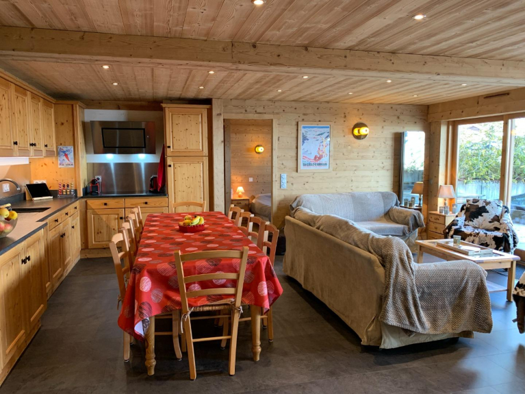 La sala de estar principal, de 30 m2, cuenta con una amplia cocina totalmente equipada, un comedor y un salón, con dos ventanales con vistas a la montaña. El amplio salón está equipado con muebles modernos y cómodos, un televisor con canales ingleses, reproductor de DVD, reproductor de CD, así como libros y juegos de mesa.