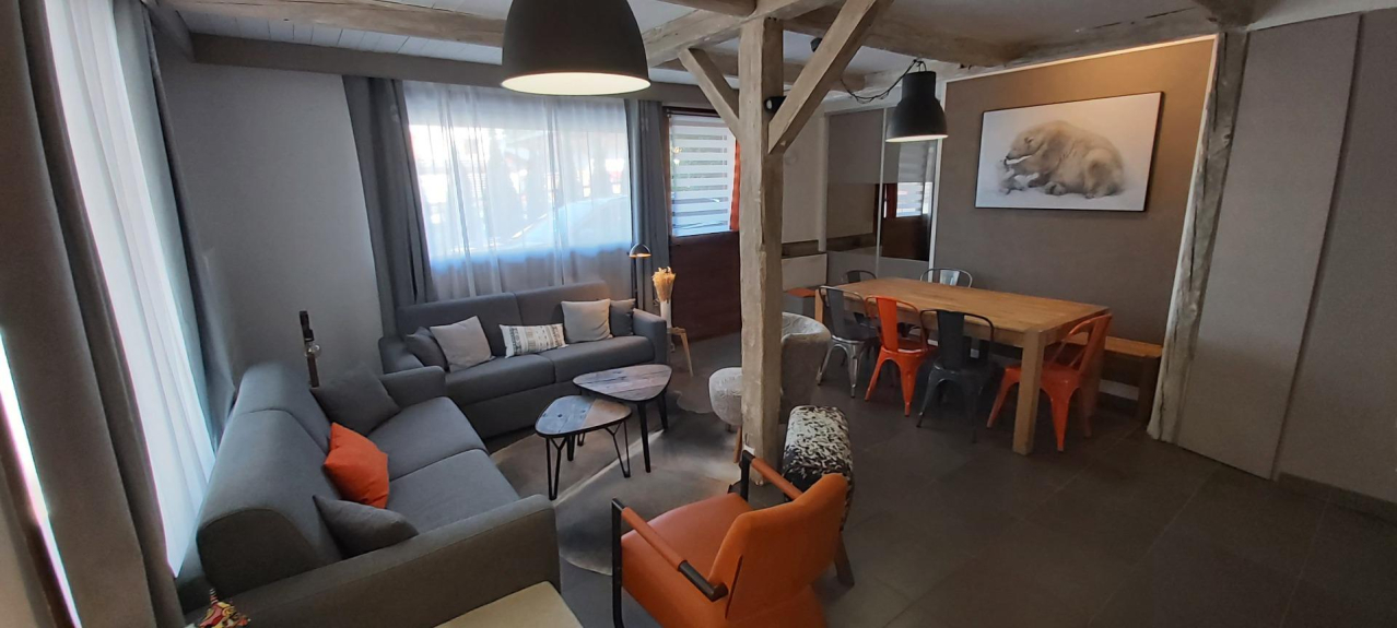 Hermoso piso de 120m2 en RCH y -1, con vista sobre la Aiguille du Midi al Este y sobre la torre de la iglesia al Oeste, esquina de la terraza, guardaesquís, 3 dormitorios, 1 esquina de cama 140x200, 1 sofá cama, 2 baños con WC. Situado en el centro de la ciudad, a 50 metros de la panadería y del Sherpa, a 50 metros del autobús y a 800 metros de las pistas. 2 plazas de aparcamiento exterior a ambos lados del piso.