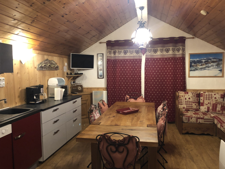 Este espacioso piso dúplex de 64m2 en el 2º piso del chalet les fontannelles, 5 habitaciones amuebladas y equipadas para 9 personas, situado en el corazón de Montchavin, y al pie de las pistas y del telecabina de coches, cerca de la ESF a 150m y de la evolución2 a 15m, tiendas, telesilla, guardería, jardín de nieve, cine, piscina.