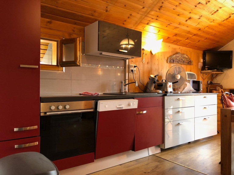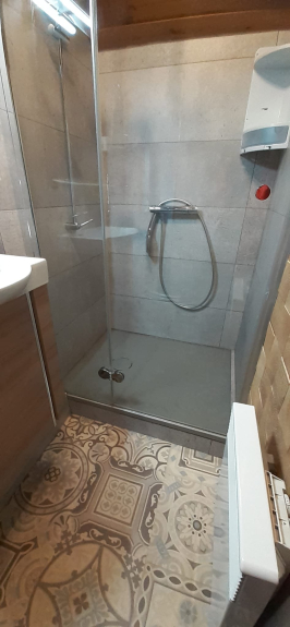 una cocina abierta, una sala de estar con un sofá (no convertible), TV, un cuarto de baño (ducha), aseo separado, un dormitorio doble con una cama de 140x190, un dormitorio con 2 camas individuales de 80x1,90