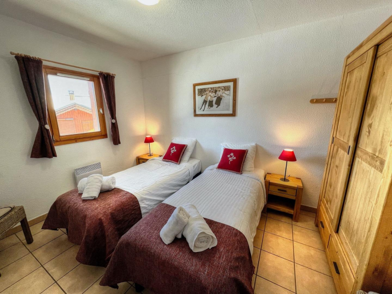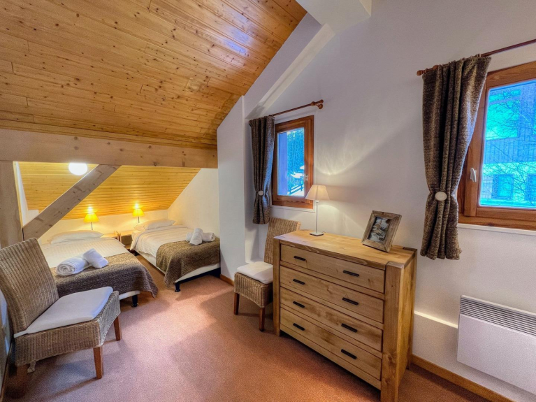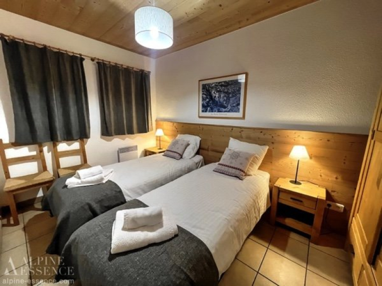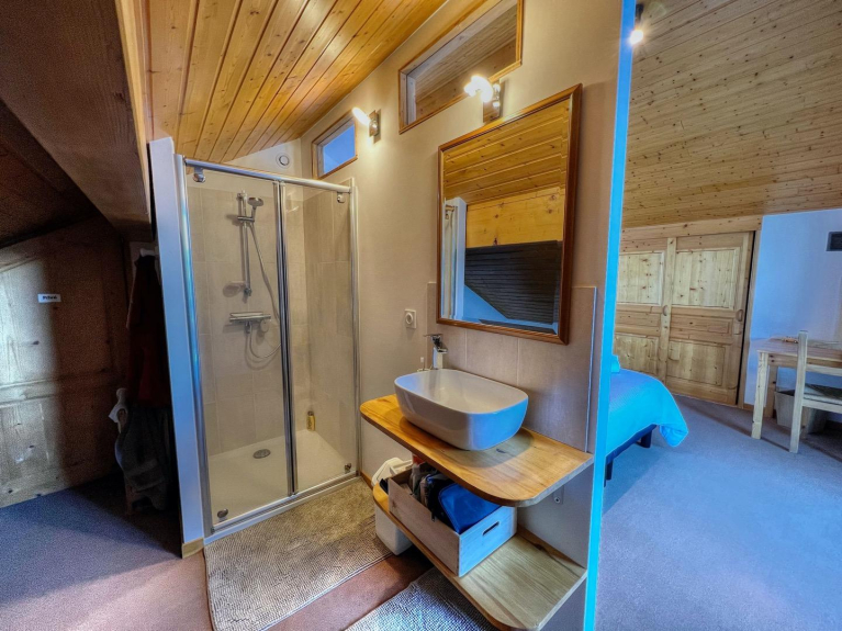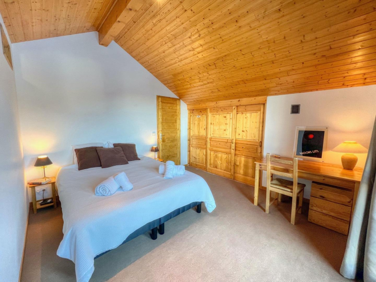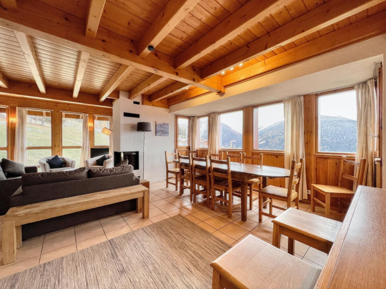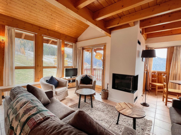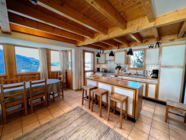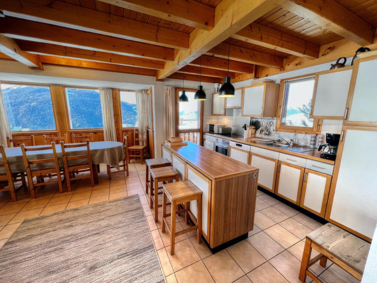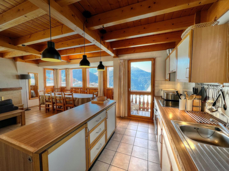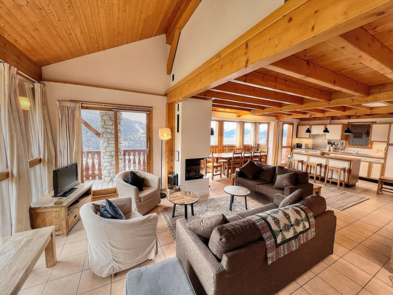 La gran sala de estar de planta abierta tiene ventanas del suelo al techo con vistas a la pista y a Vallandry. El salón cuenta con una chimenea para disfrutar de acogedoras veladas en los nuevos sofás. La cocina está totalmente equipada para su uso personal o se puede organizar un servicio de catering in situ. El chalet cuenta con calefacción eléctrica por suelo radiante y calefactores de pared, lo que lo hace siempre acogedor y confortable. Junto a la puerta principal hay grandes taquillas para guardar el equipo de forma segura.