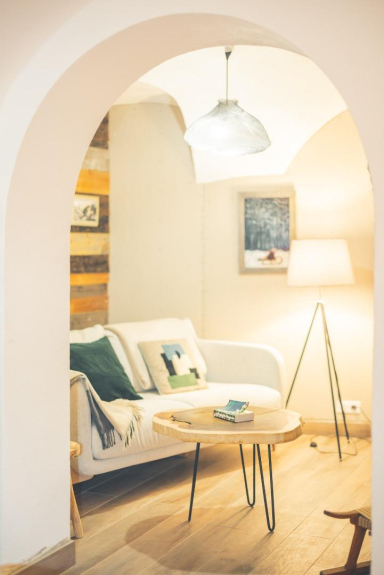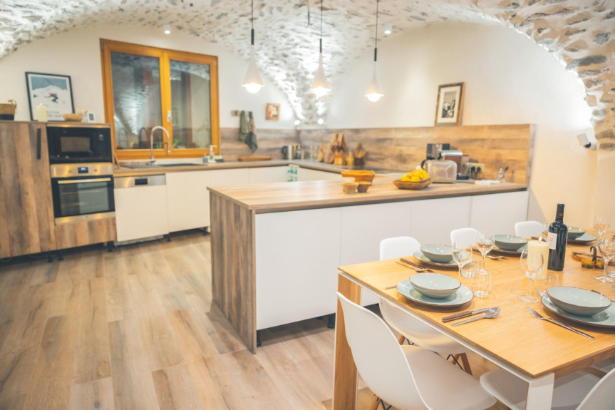 La planta baja consta, a la izquierda de la entrada, de una magnífica sala bajo techos abovedados que incluye una amplísima cocina, una mesa para 12 comensales y un cómodo salón con chimenea de bioetanol.