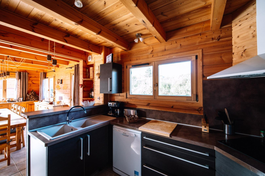 La cocina está totalmente equipada con horno, microondas, nevera y pequeño congelador, cafetera, tostadora, vitrocerámica, lavavajillas, hervidor de agua... está abierta a una zona de comedor con una gran mesa para 14 personas con todo el equipamiento de calidad previsto (vasos, cubiertos, máquinas de raclette...).